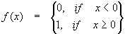 This function is zero for x values less than zero and 1 for all x greater than or equal to zero. It has a sudden step discontinuity at x = 0. Note that in the graph below, the point (0, 0) is an open circle, indicating that that single point has been left out of the function. The point (0, 1) on the other hand is a filled-in circle and is included in the graph of f(x). This insures that the graph of the function conforms exactly with the above definition.