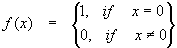 This function is zero everywhere but x = 0, where it takes on the value 1. This type of discontinuity is called a jump. The graph of this function looks like this: